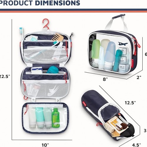 - HANGING TOILETRY BAG: Has its own 311 TSA liquid bag for short trips. Detachable clear plastic bag holds four 3 oz liquids and secures tightly to hanging bag with metal snaps. Black mesh pockets on folding bag expand and stretch to hold everything. (Dimensions folded 10in x 7in x 2in / unfolded 21in X 10in x 1in)