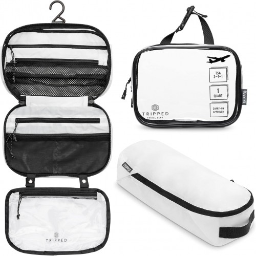 - HANGING TOILETRY BAG: Has its own 311 TSA liquid bag for short trips. Detachable clear plastic bag holds four 3 oz liquids and secures tightly to hanging bag with metal snaps. Black mesh pockets on folding bag expand and stretch to hold everything. (Dimensions folded 10in x 7in x 2in / unfolded 21in X 10in x 2in)