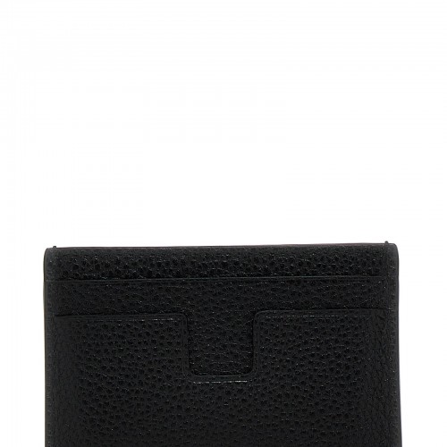 Grained leather card holder with gold metal logo application.