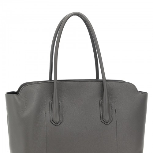 Leather shoulder bag, front logo detail, leather handles, zip closure, key padlock detail.
