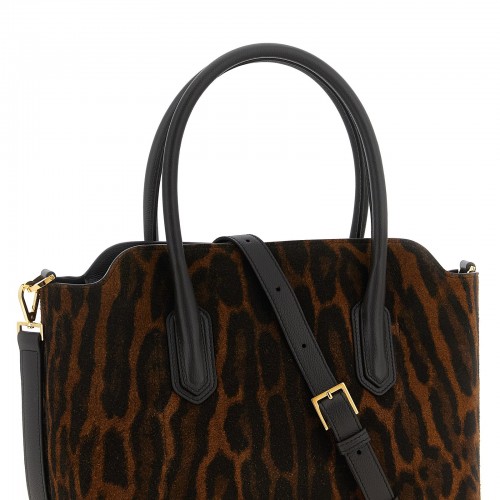 ‘Ocelot’ animal print suede handbag with leather details, double fixed handle, top zip closure, adjustable and removable shoulder strap.