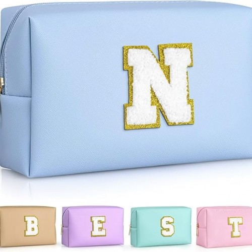 TOPEAST Initial Makeup Bag for Travel, Chenille Letter Pouch Cosmetic Bag, PU Leather Waterproof Toiletry Bag, Personalized Gifts for Bride Bridesmaids, Cute Things for Girls (Sky Blue Q)