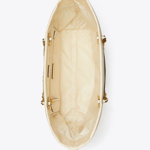 beige main compartment two chain-link top handles embossed logo to the front rear patch pocket