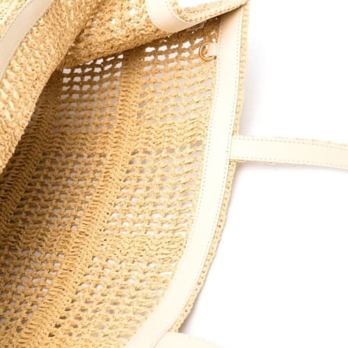 natural beige straw crochet design semi-sheer construction two flat top handles signature Double T embroidered to the front main compartment unlined open top