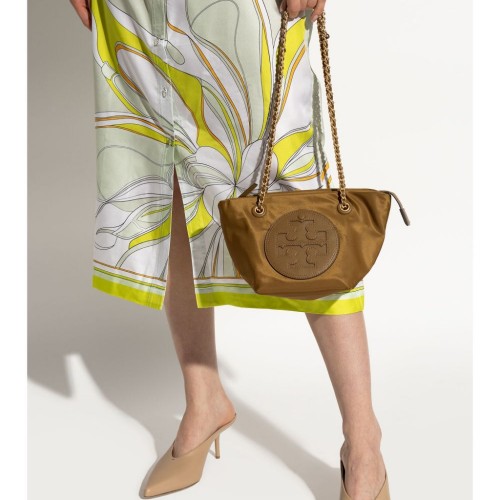 camel brown recycled nylon faux-leather trim top zip fastening adjustable chain-link shoulder strap trapeze body appliqué logo signature Double T motif main compartment multiple internal slip pockets This item is made from at least 50% recycled or upcycled materials. For recycled synthetic clothing products, we highly recommend using a microfibre-catching washing bag to ensure that no microplastics that can pollute water are released in the process. Learn more about what makes a product Conscious on our Conscious Criteria page