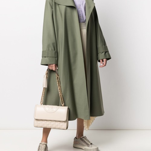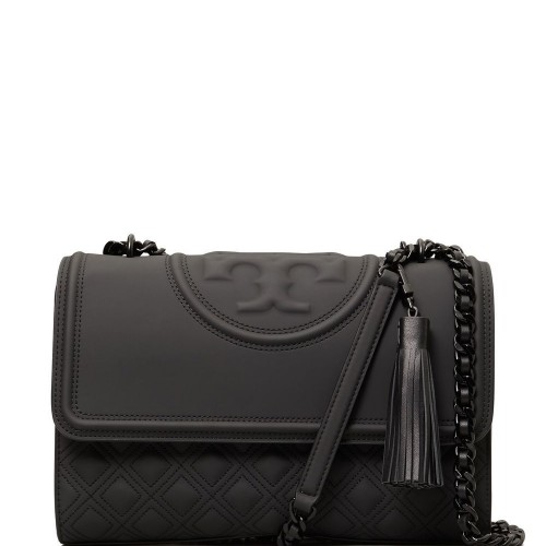New cream embossed and quilted cross-body bag from TORY BURCH featuring embossed logo to the front, quilted finish, foldover top, chain-link shoulder strap and tassel detail.