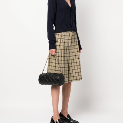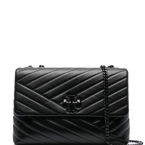 Black, calfskin, smooth grain, diamond quilting design, cylindrical design, engraved front logo, signature Double T motif, gold-tone details, leather handle with chain, removable shoulder strap, top zip closure, single compartment and pocket internal zip.