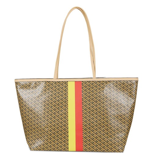 brown/multicolour all-over logo print two top handles stripe detail