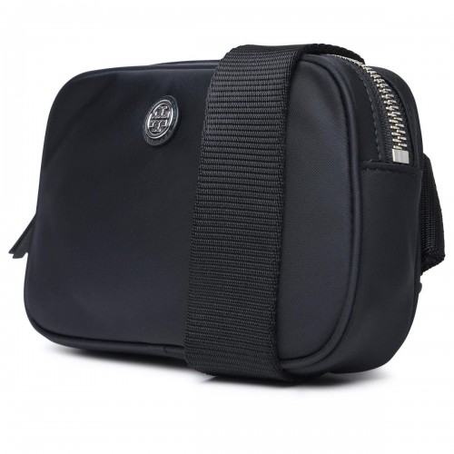 Made of nylon, adjustable ribbon shoulder strap with clip-on closure, zip closure, leather patch with double metal ‘T’ on the front, inner zip pocket, magnetic back flat pocketn19 x 11.5 x 3 cm