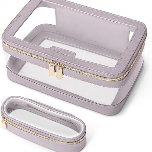 Travel Clear Makeup Bag with Makeup Brush Bag, Leather Makeup Case Toiletry Bag, Portable Cosmetic Bag Case, Transparent Waterproof Cosmetic Organizer Storage Bag for Women, Medium, Off-White