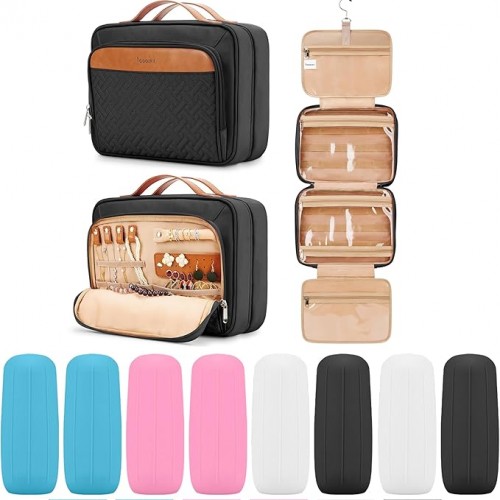 Travel Hanging Toiletry Bag for Women and Men, with 8 Leak Proofing Silicone Bottle Covers, Waterproof Makeup Accessories, Cosmetic Essentials, Toiletries Dopp Kit Set with Jewelry Organizer, Blue