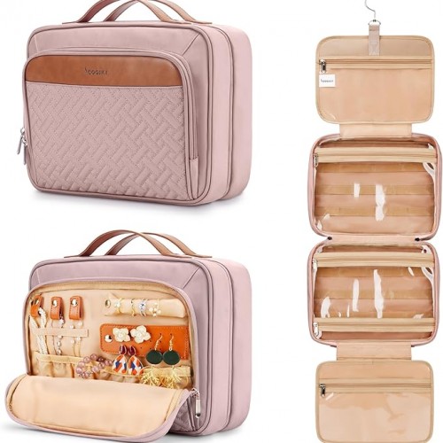 - PATENT PENDING GREAT ORGANIZER MASTER – This wash bag is designed with 4 toiletry storage compartments and a special jewelry compartment; you can easily put your wash products and jewelry separately to make your journey organized. The size of the fully-loaded state is 12.5”L x 10”H x 4.5”W, the 2 main compartments can hold up to 8 full-sized toiletries and cosmetics at the same time, no worries for long-distance travel.
