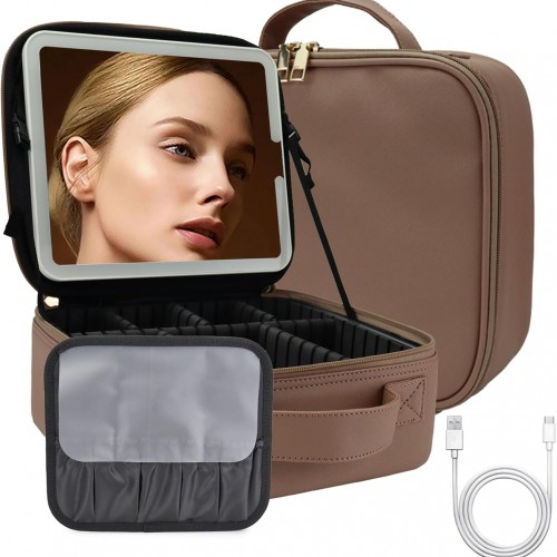 Travel Makeup Bag for Makeup Artists Large Makeup Case,with Mirror 3 Color Setting and Detachable 10x Magnifying Mirror Travel Makeup Bag,Portable Storage and Adjustable Dividers(Dark Pink)