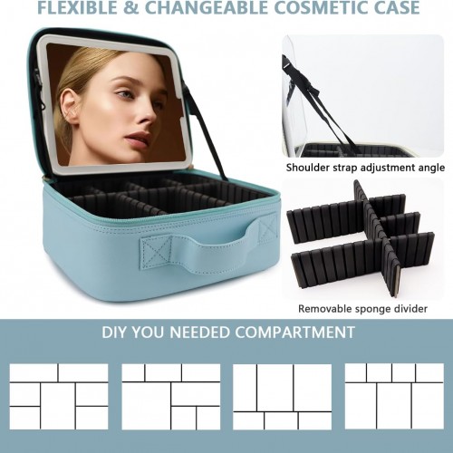 Travel Makeup Bag for Women and Makeup Artists Cosmetic Organizer Large Makeup Case,Travel Makeup Bag with Mirror 3 Color Setting,Portable Storage and Adjustable Dividers(baby blue)