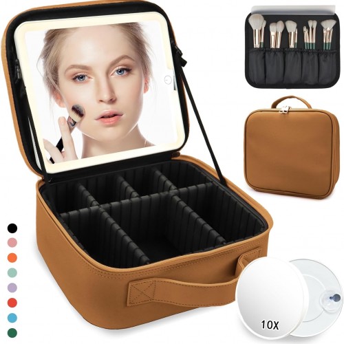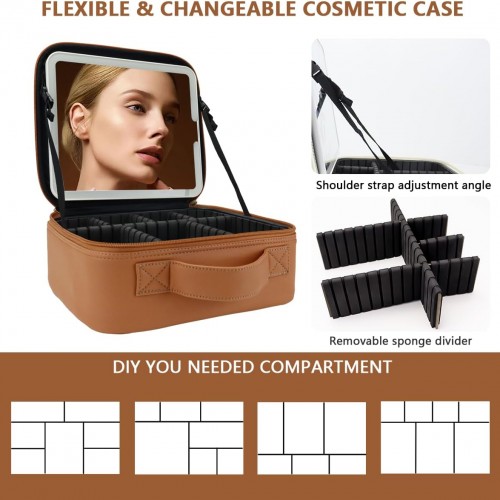 Travel Makeup Bag for Women and Makeup Artists Cosmetic Organizer Large Makeup Case,Travel Makeup Bag with Mirror 3 Color Setting,Portable Storage and Adjustable Dividers(light brown)