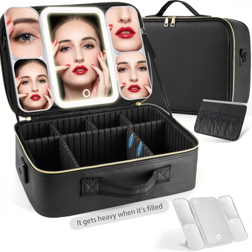 Travel Makeup Bag with LED Mirror – Waterproof Cosmetic Train Case with Adjustable Dividers, Portable Makeup Organizer and Toiletry Bag for Women, Pink Teens & Girls Gift