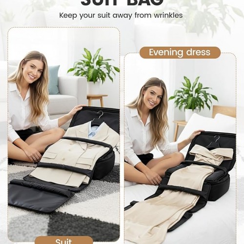 - Travel Backpack & Garment Bag:This innovative backpack effortlessly merges the functionality of a travel backpack with a garment bag, featuring foam roll bars that securely hold suits, shirts, and dresses in place. Engineered to keep your attire smooth and wrinkle-free throughout your journey and transit, it eliminates the hassle of post-travel ironing—ideal for business travelers or anyone seeking polished style on the go.