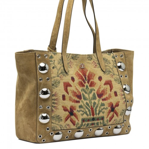 Valentino Garavani “Nellcôte” suede shopper bag with semi-rigid structure, frontal floral embroidery and profile decorated with metal rivets. The model features a shoulder design with double handles, small metal elements with Signature VLogo and an unlined interior with a zippered pocket for essentials. Surface and handles are made of suede with a uniform finish.