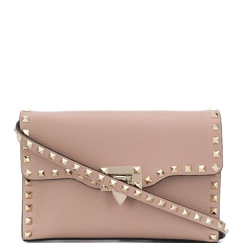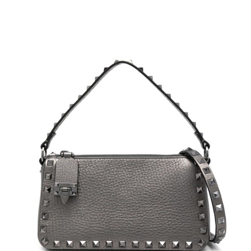 grey calf leather pebbled texture signature Rockstud embellishment clasp fastening foldover top detachable shoulder strap main compartment internal slip pocket debossed internal logo This piece comes complete with a protective dust bag.