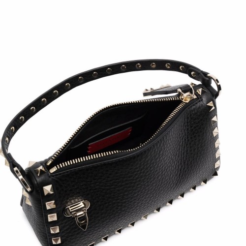 black calf leather grained texture gold-tone Rockstud embellishment single top handle detachable shoulder strap logo print to the front main compartment internal card slot internal logo patch full lining top zip fastening hook fastening