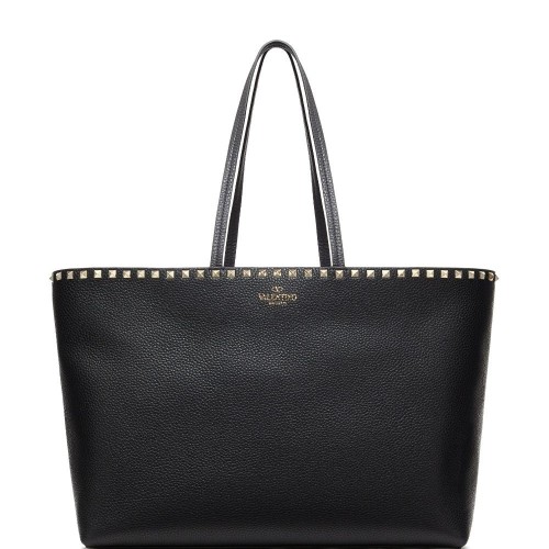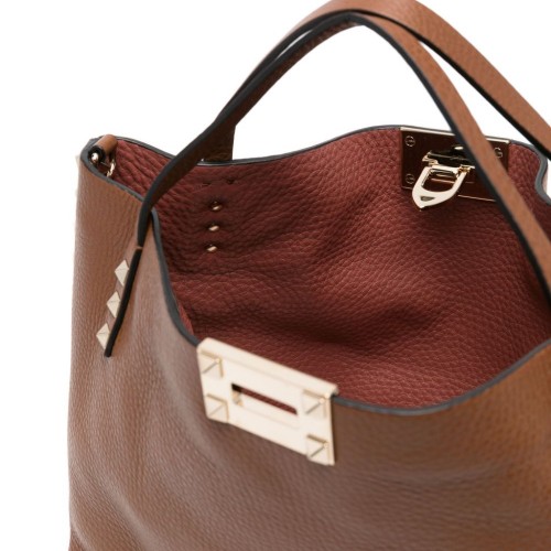 cognac brown leather pebbled texture signature Rockstud detailing flip-lock fastening two top handles adjustable detachable shoulder strap main compartment removable pouch contrast lining