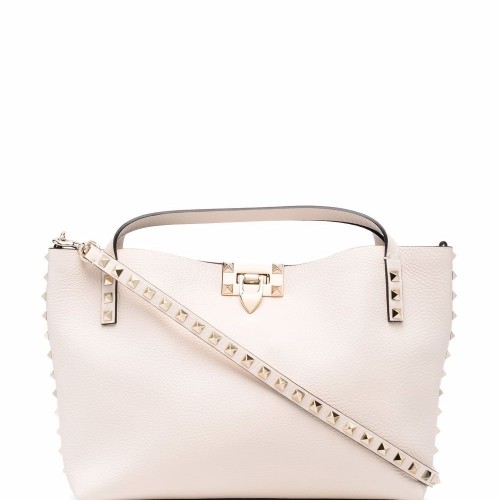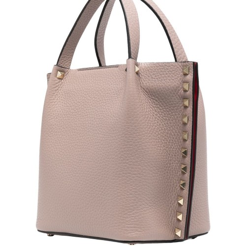 Rockstud leather tote bag from VALENTINO GARAVANI featuring powder pink, calf leather, signature Rockstud detailing, adjustable shoulder strap, two rounded top handles, open top, main compartment and internal logo patch.
