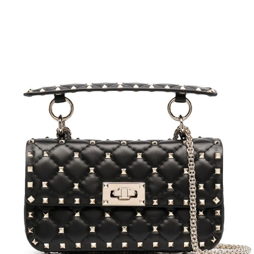 Gold-tone Rockstud details, padded finish, gold-tone details, flat handle, flap closure, twist lock, chain shoulder strap and internal bellows pocket.
