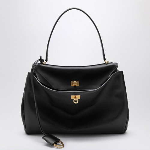 Black leather Valentino Garavani bucket bag featuring a shoulder strap, drawstring fastening, metal Signature Vlogo on the front and antiqued gold metal hardware.
