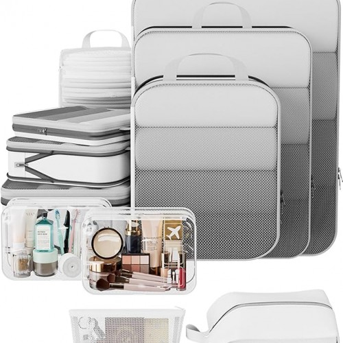 - All-in-One Organization for Your Travel Needs – This 11-piece set includes six compression cubes (S/M*2/L*2/XL) for systematic packing: S for underwear/socks, M for T-shirts and shirts, L for jeans and light sweaters, and XL for coats or bulky items. Also features two PVC toiletry/makeup bags, a machine-washable laundry bag, a shoe bag, and a multi-purpose zippered pouch—keeping your luggage tidy and efficient.
