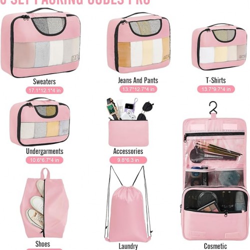 Veken 8 Set Packing Cubes for Travel Essentials, Pink Suitcase Organizer Bags in 4 Sizes, Carry-On Luggage Accessories with Large Laundry & Hanging Toiletry Bag, Must-Have for Airplane, Road Trip