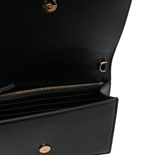 Greca Goddess mini bag from VERSACE featuring black, calf leather, gold-tone hardware, foldover top with magnetic fastening, main compartment, internal zip-fastening pocket, internal card slots, signature La Greca plaque and signature La Greca chain shoulder strap.