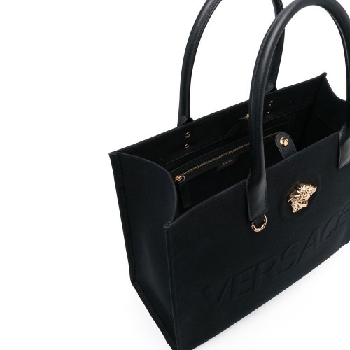 La Medusa canvas tote bag from Versace featuring black, canvas, Medusa plaque detail, embossed logo to the front, two rolled top handles, press-stud fastening, main compartment and internal zip-fastening pocket.