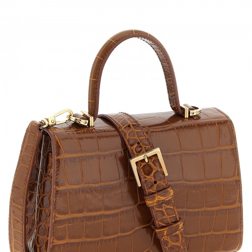 Small handbag in embossed crocodile effect leather, magnetic flap closure with front metal ‘Medusa ’95’ detail, fixed handle, rigid base with metal feet, adjustable and removable shoulder strap.
