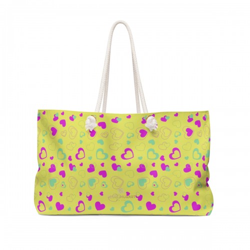 White Pink Hearts Weekender Bag, Valentine’s Day Designer Weekender Bag Gift For Her- Made in USA 24×13