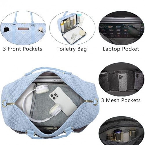 - FREE TOILETRY BAG + SEPARATED WET AND DRY GYM BAG HOSPITAL BAG – The carry on duffel bag comes with 1 toiletry bag to store your cosmetics/toiletries. Also overnight bags for women have a waterproof PVC lined pocket that separates wet and dry items like clothes, towels and swimsuits. Light blue duffel bag is the perfect companion for outdoor and indoor sports like workouts, yoga, camping, beach etc. If you’re a novice mother, it can also be used as a mom hospital bag, maternity bag or diaper bag.