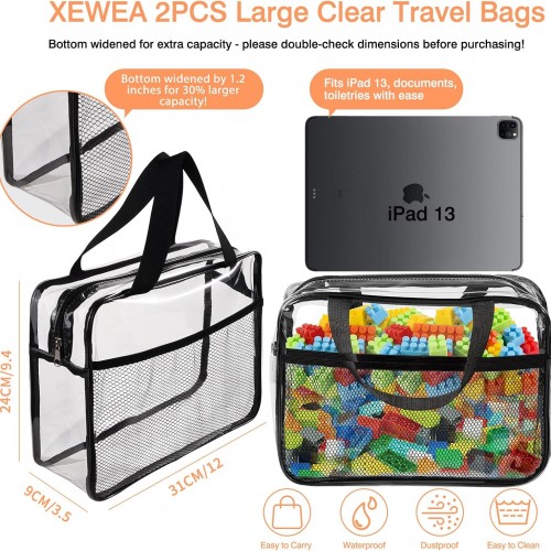 - 【TSA Approved for Travel】XEWEA 2 Pack Large Clear Toiletry Bags are following TSA 3-1-1 rules.With dimensions of 12 x 9.4 x 3.5 in(Bottom widening, larger capacity), they provide ample space to fit your clothes,toiletries, cosmetics, skincare products, etc, ensuring you have everything you need for your trip.