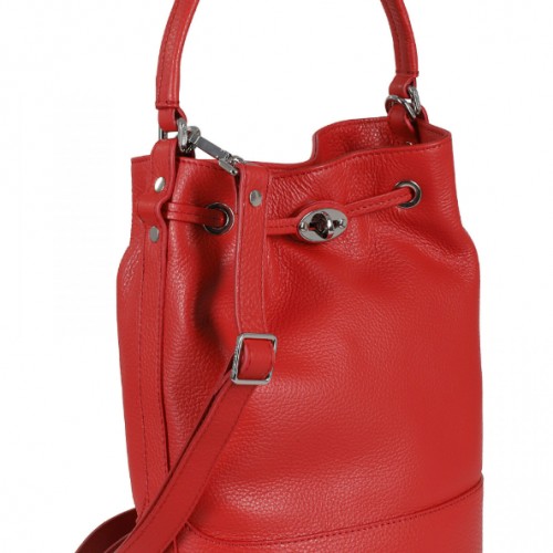 Hammered leather. Bucket design. Internal magnetic closure. External twist lock. Top handle. Removable shoulder strap.